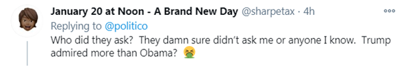 也有網友表示,“他們問了誰?他們肯定沒問我或我認識的任何人。特朗普比奧巴馬更受人尊敬?”↓