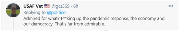 一些網友則表示,“尊敬他什麼?搞砸了疫情應對、經濟和我們的民主。離受尊敬還差得遠呢。”↓