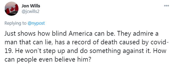 也有網友提到了疫情。一位網友如此寫道:“正好説明了美國人有多盲目。他們欽佩一個會撒謊、讓新冠死亡人數創下紀錄的人。他不會在有需要的時候站出來,做一些抗擊(新冠)的事。人們怎麼能相信他呢?”↓