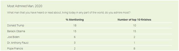結果顯示,關於“最受尊敬男性”的調查中,特朗普以18%的支持率位居榜首。而在特朗普之後,前總統奧巴馬以15%的支持率緊隨其後,當選總統拜登則以6%的支持率排名第三,因疫情而被公眾所熟知的公衞專家福奇緊隨其後排在第四位。