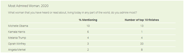 在關於“最受尊敬女性”的調查中,米歇爾·奧巴馬以10%的支持率排名第一,美國當選副總統哈里斯則以6%的支持率位居第二,現任第一夫人梅拉尼婭排在第三位。德國總理默克爾位列第五名。