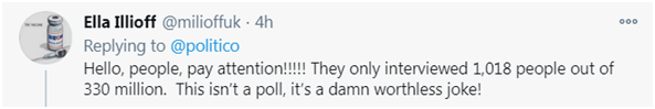不乏網友對民調的普遍性提出質疑。一位網友稱“大家注意一下!他們只採訪了3.3億人中的1018人。這不是民意調查,這(只)是個毫無價值的笑話!”↓