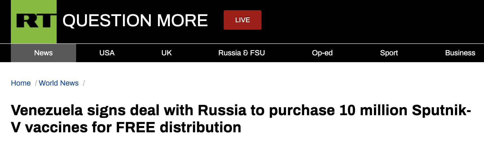 據俄羅斯衞星通訊社此前消息,委內瑞拉高官稱該國已向俄羅斯、中國和古巴提議,由委內瑞拉參與這些國家開發的疫苗生產,並單獨向俄羅斯提議參與其疫苗試驗。馬杜羅在8月16日的電視演講中曾説,他很高興看到俄羅斯成為全球首個能為本國公民接種新冠疫苗的國家,並表示在委內瑞拉獲得新冠疫苗後,他將是該國首名接種者。