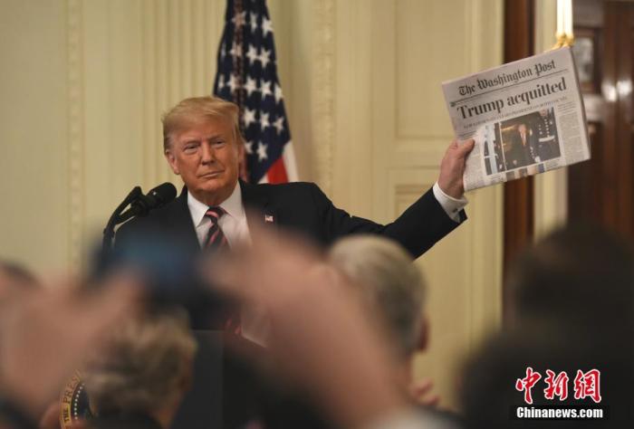 2020年2月6日,美國總統特朗普就彈劾案“無罪”裁決發表講話。中新社記者 陳孟統 攝