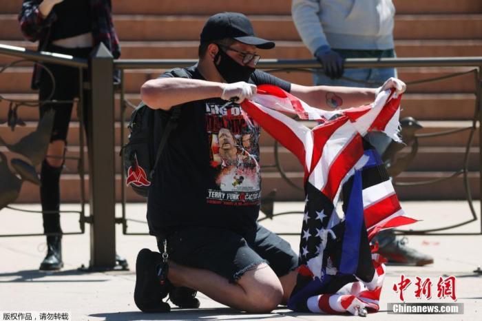 資料圖:當地時間2020年5月29日,美國丹佛,示威者撕毀了一面美國國旗。
