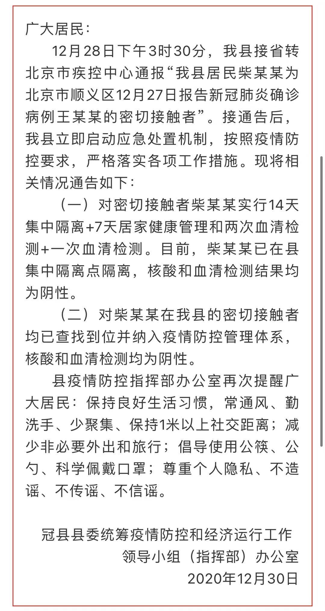 記者今天(12月30日)從山東冠縣縣委統籌疫情防控和經濟運行工作領導小組(指揮部)辦公室瞭解到,12月28日下午3時30分,山東冠縣接省轉北京市疾控中心通報“冠縣居民柴某某為北京市順義區12月27日報告新冠肺炎確診病例王某某的密切接觸者”。接通告後,冠縣立即啓動應急處置機制,按照疫情防控要求,嚴格落實各項工作措施。現將相關情況通告如下: