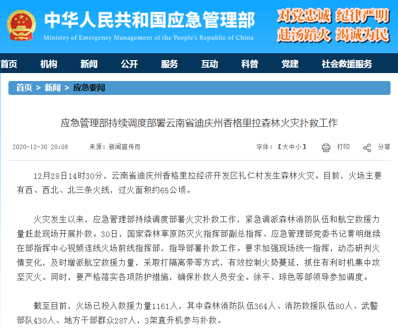 應急管理部:雲南省迪慶州森林火災過火面積約65公頃,已投入救援力量1161人