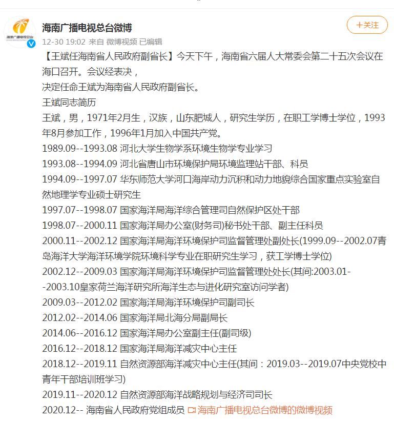 今天下午,海南省六屆人大常委會第二十五次會議在海口召開。會議經表決,決定任命王斌為海南省人民政府副省長。