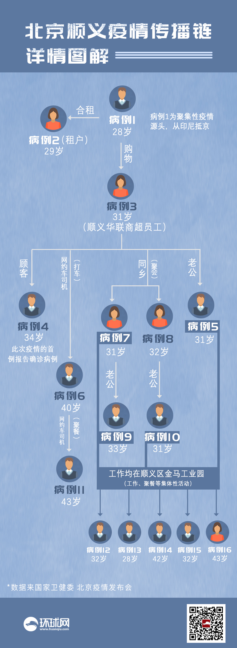 病例3為傳播鏈中的關鍵病例,在商超售賣衣物期間傳播給病例4(某男,34歲),病例4為此次疫情的首例報告確診病例。病例3傳播給其丈夫病例5(某男,31歲);在乘坐網約車期間傳播給網約車司機病例6(某男,40歲);在共同聚會、購物、同乘網約車期間傳播給同鄉病例7(某女,31歲)和病例8(某女,32歲)。病例6通過共同聚餐傳播給同為網約車司機的病例11(某男,43歲)。病例7和病例8分別傳播給其丈夫病例9(某男,33歲)和病例10(某男,31歲)。病例5、7、9、10的工作地點均為順義區金馬工業園,通過共同工作和聚餐等聚集性活動,導致病例12(某男,32歲)、13(某男,28歲)、14(某男,42歲)、15(某男,32歲)、16(某女,43歲)感染。