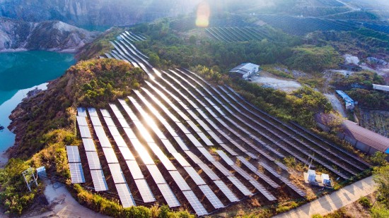 上圖:廣東梅州市平遠縣東石鎮利用廢棄礦山建成光伏發電站,綠色的山坡和藍色的太陽能電板互相映照,為荒山添上了光彩。 2020年12月27日攝。 (馮錫權/人民圖片)