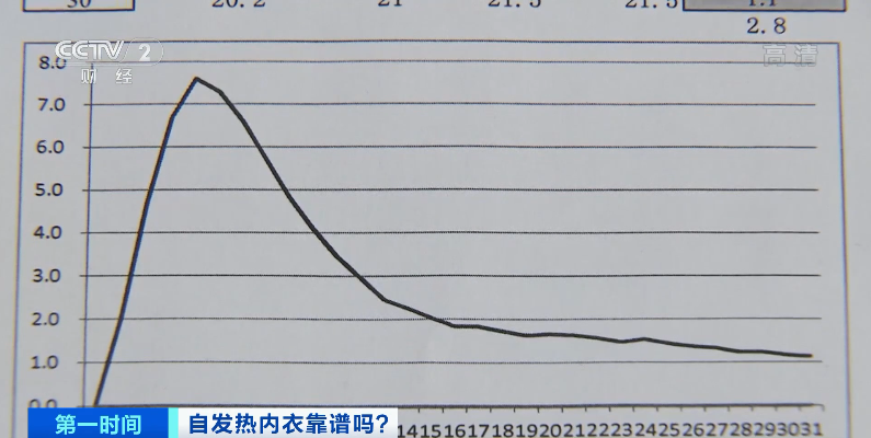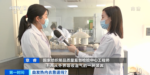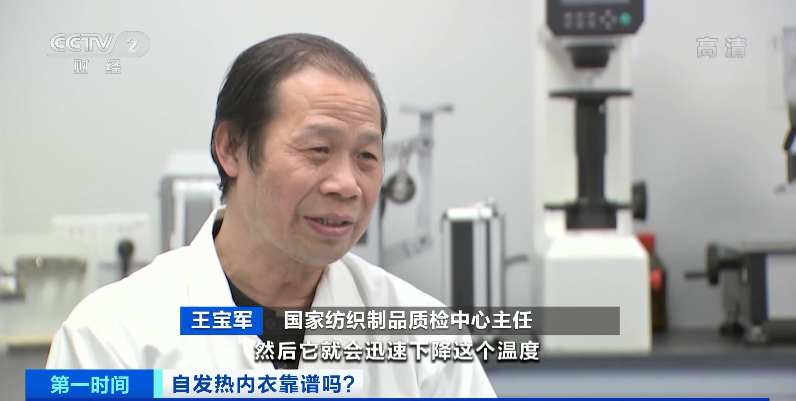 國家紡織製品質檢中心主任 王寶軍 :自發熱內衣四五分鐘或者是五六分鐘吸濕發熱,然後就會迅速下降温度。當達到二三十分鐘的時候,織物基本上就不會再產生熱了。咱們説它温度提高了2℃、3℃或者幾攝氏度,也就是一會兒時間,然後就恢復原狀。我覺得自發熱內衣根本起不到保温作用。
