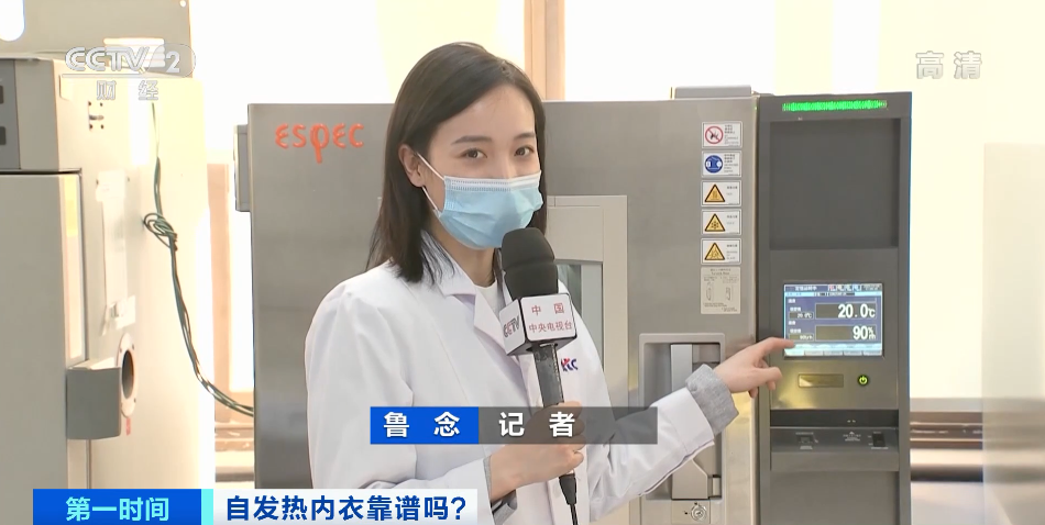 記者 魯念 :在我身後是一台吸濕發熱的儀器,根據國家標準我們把温度設定在20℃,濕度設定在90%,再把樣品放進這樣一個環境箱裏,再來檢測樣品吸濕發熱的效果如何。