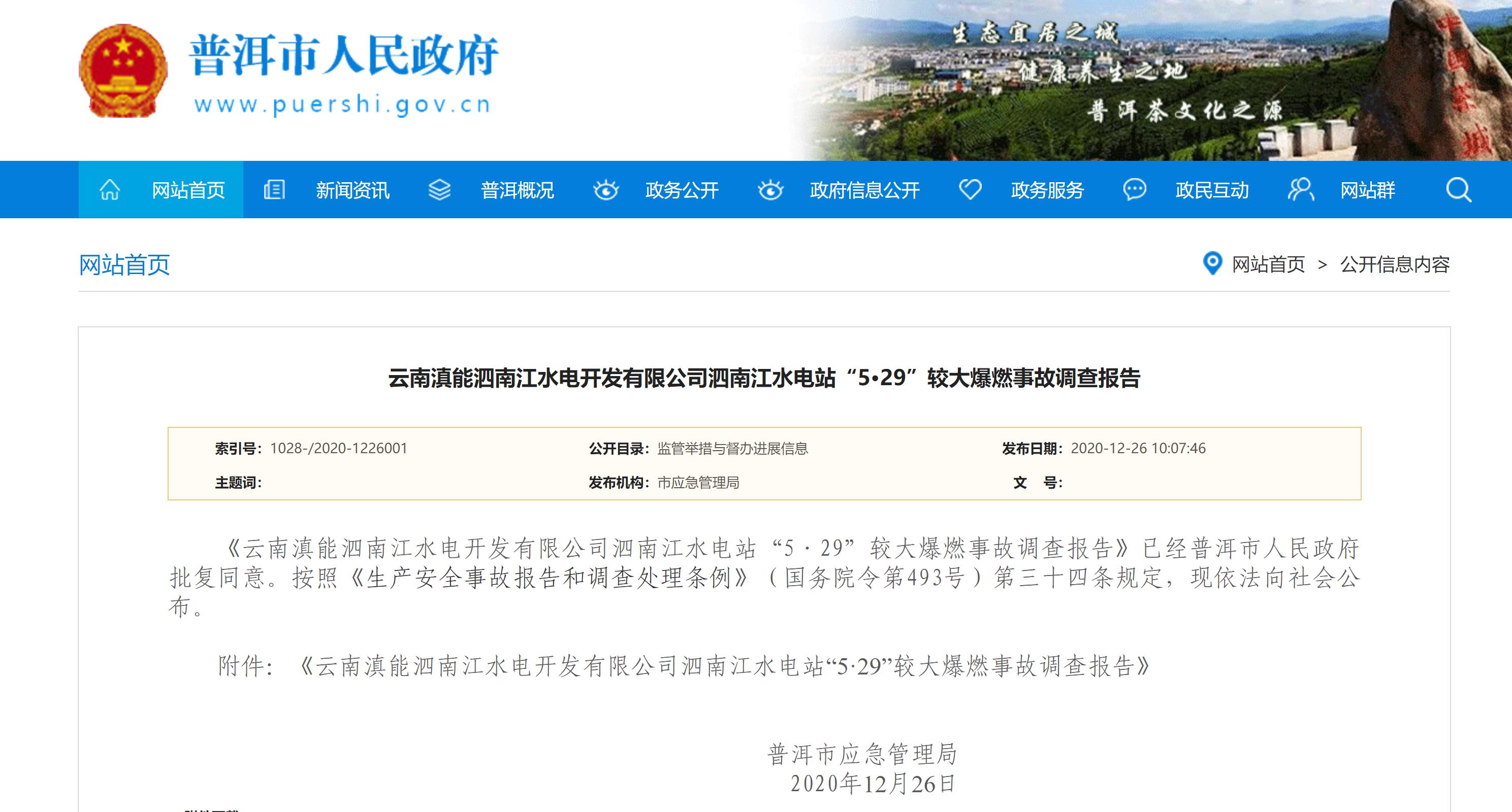 日前,雲南普洱市人民政府公佈了泗南江水電站“5·29”較大爆燃事故調查報告,今年5月29日11時10分,位於普洱市墨江縣的雲南滇能泗南江水電開發有限公司泗南江水電站大壩左岸泄洪衝沙(交通通風)洞內發生一起爆燃事故,造成7人死亡、4人受傷,直接經濟損失1578.9811萬元。經認定,事故系一起因異常水文氣象條件致含甲烷氣體爆燃的較大生產安全事故。