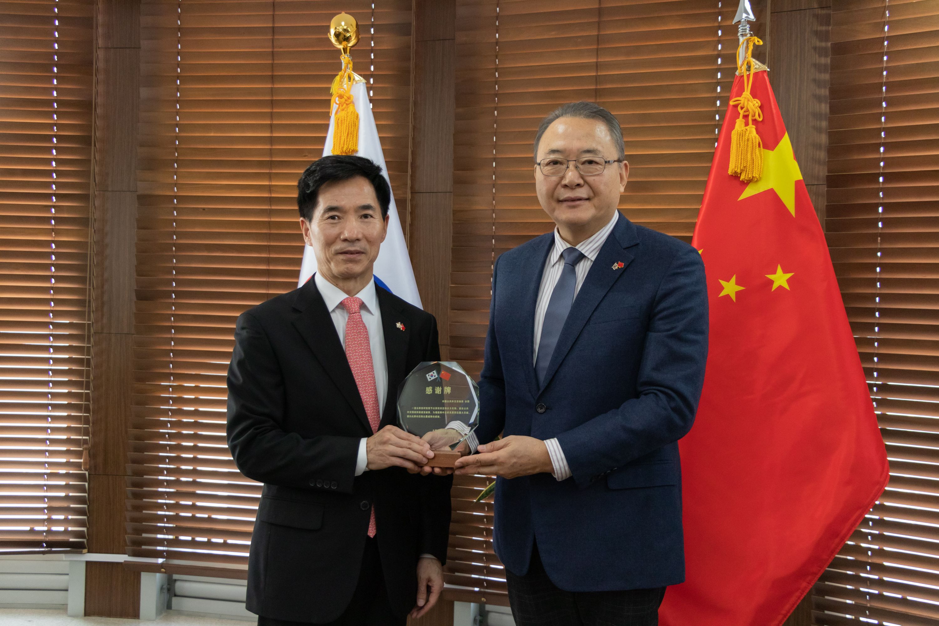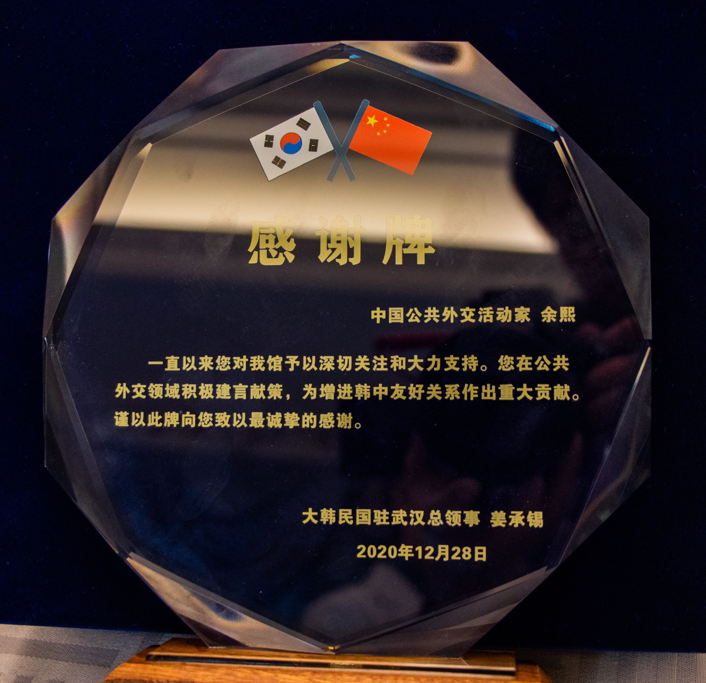 感謝他為中韓兩國文化交流作出的貢獻,韓國駐漢總領事館向餘熙頒發感謝牌
