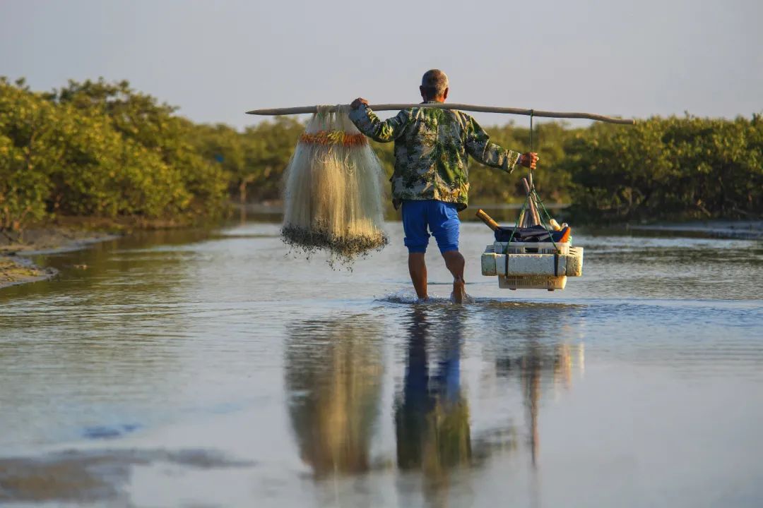 近日,漁民在廣西北部灣海域附近灘塗撒網捕撈。徐紹榮攝