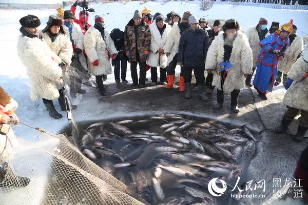 12月26日,黑龍江哈爾濱第七屆長嶺湖冬捕冰釣旅遊活動在哈爾濱道里區長嶺湖啓幕,漁民們將魚打撈上岸。趙麗英攝