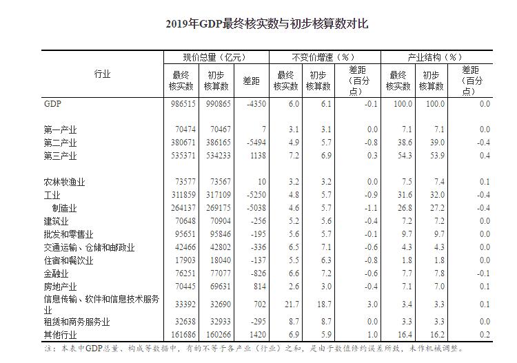 經最終核實,2019年,GDP現價總量為986515億元,比初步核算數減少了4350億元;按不變價格計算,比上年增長6.0%,比初步核算數下降0.1個百分點。三次產業和各行業數據見附表。