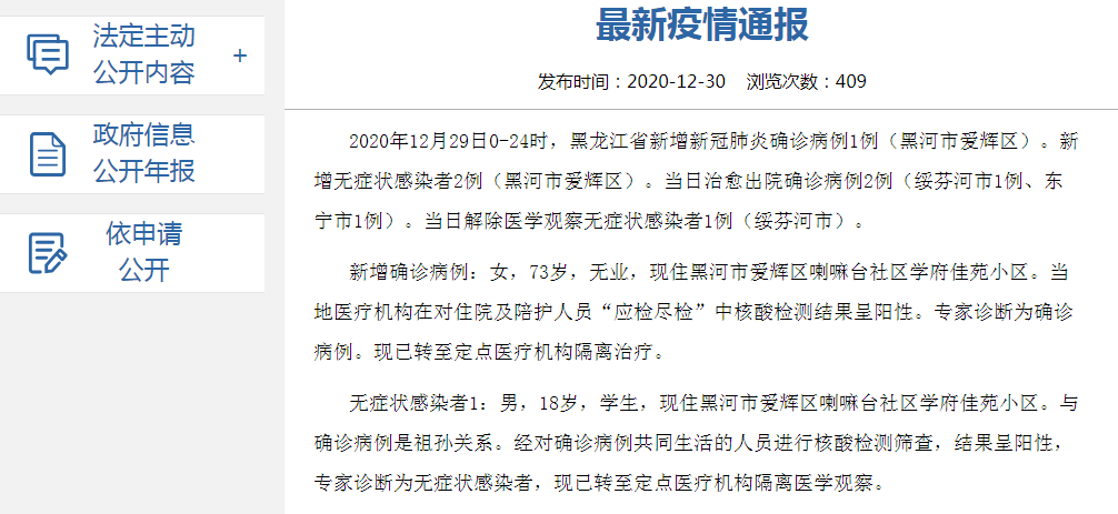 2020年12月29日0-24時,黑龍江省新增新冠肺炎確診病例1例(黑河市愛輝區)。新增無症狀感染者2例(黑河市愛輝區)。當日治癒出院確診病例2例(綏芬河市1例、東寧市1例)。當日解除醫學觀察無症狀感染者1例(綏芬河市)。