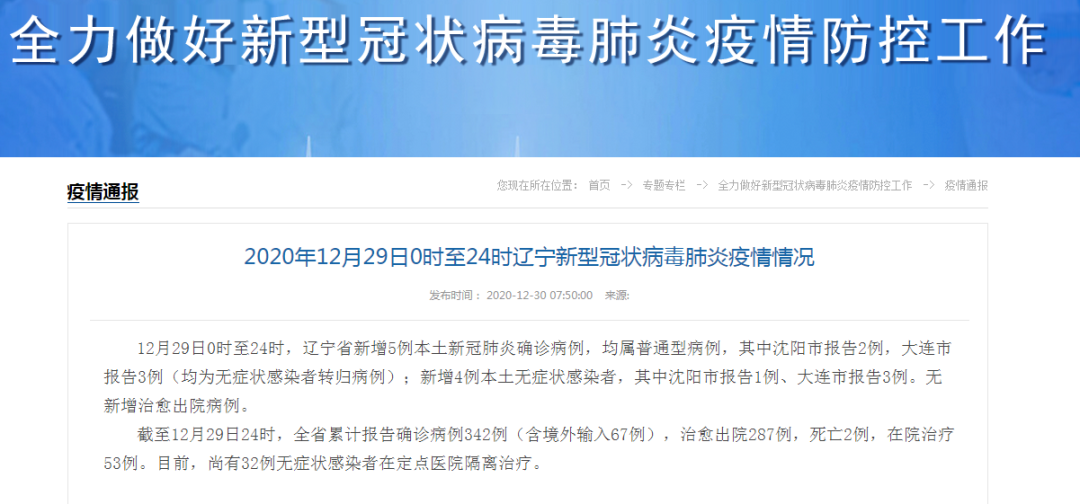 12月29日0時至24時,遼寧省新增5例本土新冠肺炎確診病例,均屬普通型病例,其中瀋陽市報告2例,大連市報告3例(均為無症狀感染者轉歸病例);新增4例本土無症狀感染者,其中瀋陽市報告1例、大連市報告3例。無新增治癒出院病例。