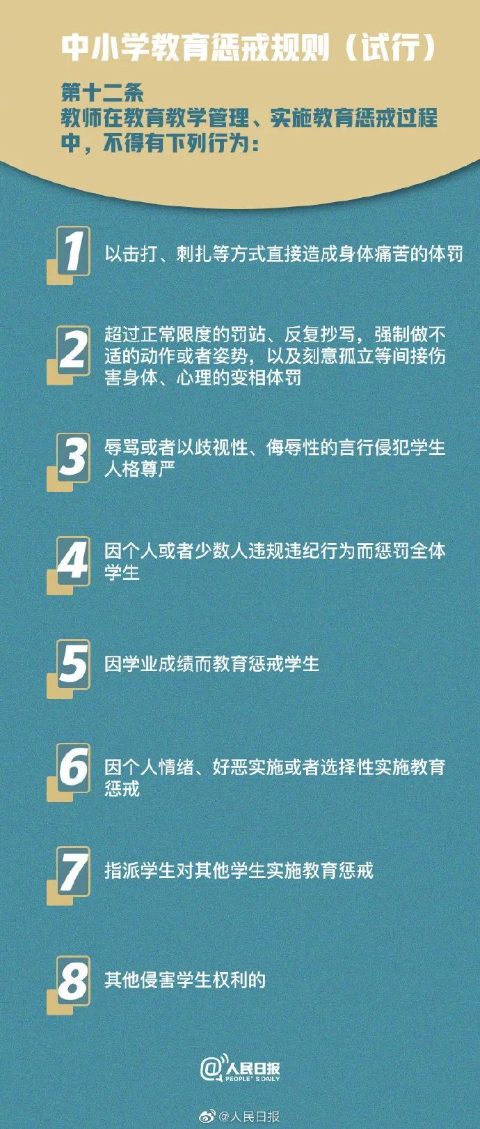 《規則》強調,教育懲戒與體罰和變相體罰是不同性質的行為,明確禁止了 七類不當教育行為,劃定教師行為紅線 ,規定了對越界教師的處罰方式,方便各方監督。同時,《規則》也強調學校應當支持、監督教師正當履行職務,維護教師合法權益,教師無過錯的,不得因教師實施教育懲戒而給予其處分或者其他不利處理。《規則》還明確了教育懲戒的相關救濟程序,並鼓勵充分發揮家長在學生管理中的作用,形成育人合力。