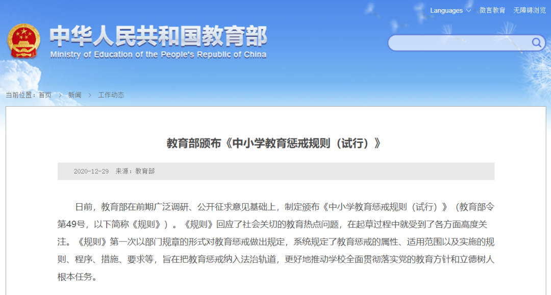 日前,教育部在前期廣泛調研、公開徵求意見基礎上,制定頒佈《中小學教育懲戒規則(試行)》(教育部令第49號,以下簡稱《規則》)。《規則》回應了社會關切的教育熱點問題,在起草過程中就受到了各方面高度關注。《規則》第一次以部門規章的形式對教育懲戒做出規定,系統規定了教育懲戒的屬性、適用範圍以及實施的規則、程序、措施、要求等,旨在把教育懲戒納入法治軌道,更好地推動學校全面貫徹落實黨的教育方針和立德樹人根本任務。