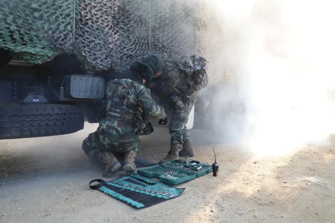“你部1輛警戒防衞車引爆化學地雷,右前輪爆胎……”行軍途中,特情突至,三防骨幹立即前出偵測“毒劑”,指揮員根據偵測結果,組織官兵進行全身防護。這邊,穿戴好防毒面具的修理骨幹馬不停蹄,迅即對受損輪胎實施搶修。