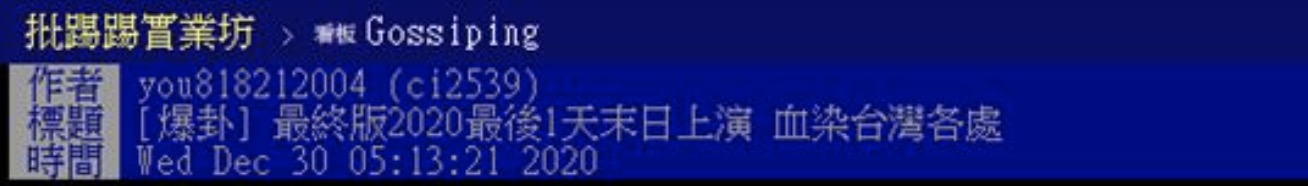 報道稱,一位網名為“you818212004”的網友今天凌晨在“PTT”發文,文章標題為“最終版2020最後一天末日上演!血染台灣各處。”