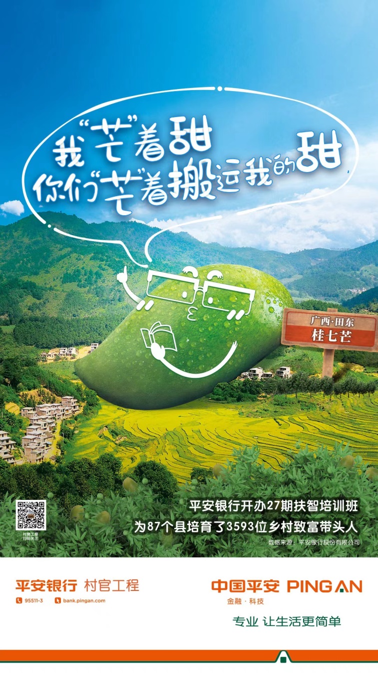 星星之火,可以燎原。通過融智、融資、品牌和科技賦能,平安銀行幫助一個又一個貧困村擺脱貧困,為助力鄉村振興貢獻力量。就像平安銀行推出的系列海報展示的那樣,“村官工程”扶貧果實滿枝椏。