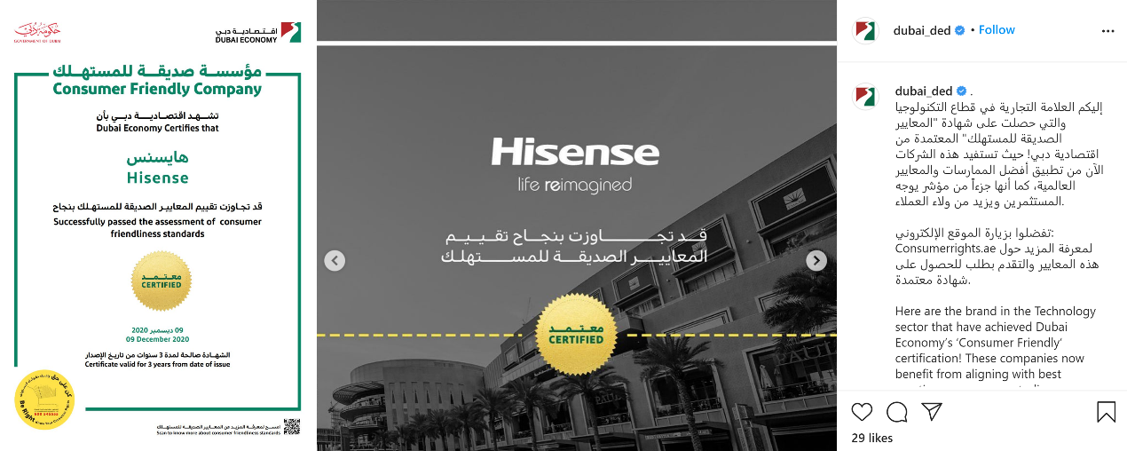 海信被阿聯酋迪拜經濟部評為“消費者友好型企業”