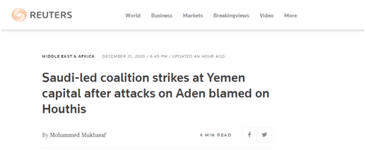 【環球網報道 記者 張曉雅】英國路透社最新消息稱,當地時間12月31日,沙特阿拉伯領導的多國聯軍戰機襲擊了由胡塞武裝控制的也門首都薩那多處地點,以對前一天也門亞丁機場發生的爆炸襲擊進行“報復”。