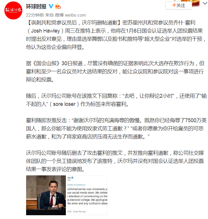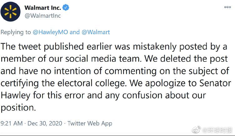 沃爾瑪公司賬號隨後刪去了攻擊霍利的推文,併發推向霍利道歉,稱公司社交媒體團隊的一個員工錯誤地發佈了該推特,沃爾瑪並沒有對國會認證選舉人團投票結果一事發表評論的意圖。