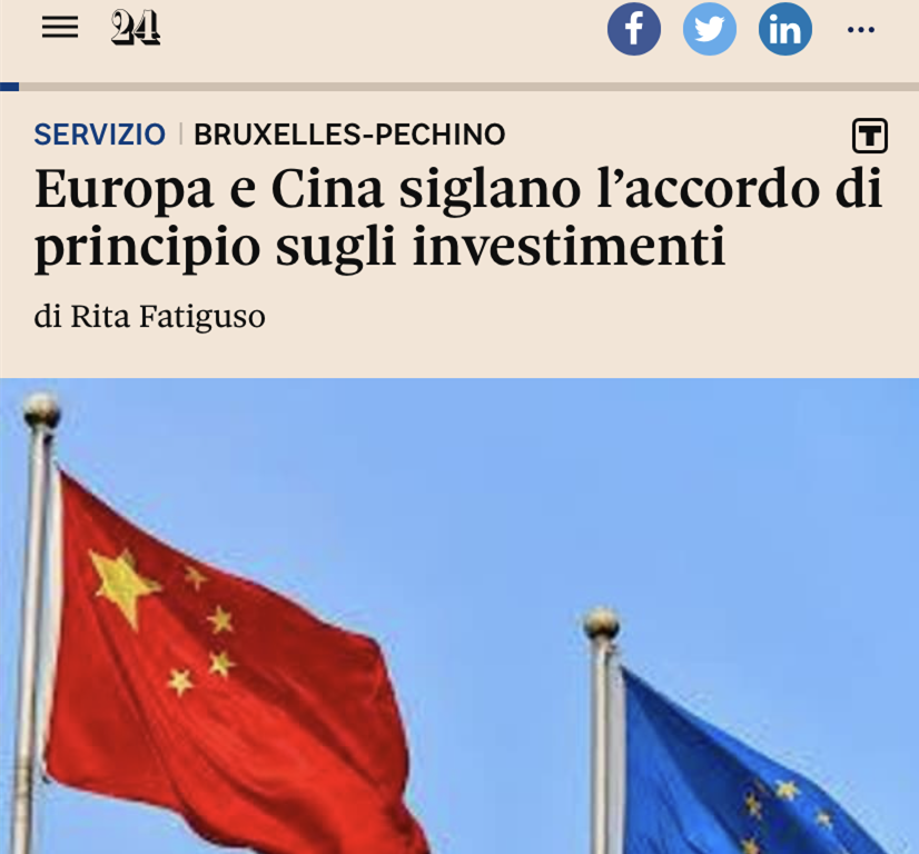意大利最大的財經類報紙《24小時太陽報》發文表示“兩個巨人最終彼此相會”。文章指出,中國是歐洲的第二大投資市場,投資協定的達成將為歐洲企業在華投資提供便利,尤其是在電動車、金融、健康等行業,可以説是前所未有的一份協議。