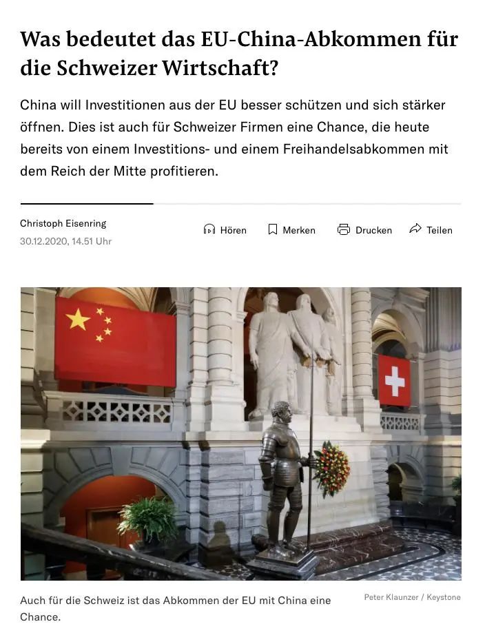 瑞士最大的報紙《新蘇黎世報》發表文章指出,已經從瑞中《自由貿易協定》中受益的瑞士企業不用擔心會受到不利影響,瑞士企業也將從歐中投資協定中受益。