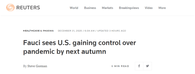 福奇告訴紐瑟姆,他預計明年4月,疫苗將根據需求向公眾廣泛提供。而假設廣泛的疫苗接種工作將持續到5月、6月和7月,福奇繼續説:“到初秋時,我們將有足夠好的羣體免疫力,恢復某種表面上的正常——學校、劇院、體育賽事、餐館(正常運營)。”