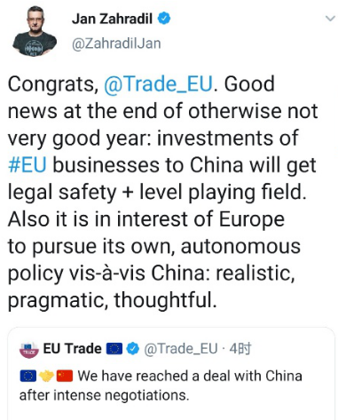 歐洲議會國際貿易委員會第一副主席扎哈迪爾(Jan Zahradil)第一時間在社交媒體上祝賀説:“2020年原本不太好,但年底的這則好消息改變了這一年。”此協定有利於歐洲企業更好地在華投資,正是尋求“自主”對華政策的歐盟所需要的。他用了三個詞來形容歐盟“自主的”對華政策:“現實、務實、考慮周全”。