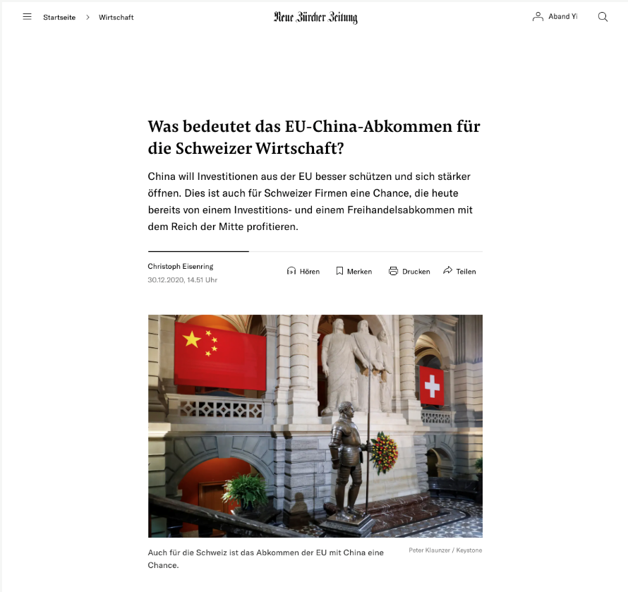 瑞士最大的報紙《新蘇黎世報》評論説,瑞士企業不用擔心作為非歐盟國家會吃虧,反而瑞士還能受益。因為如果歐盟公司增加對華投資,也將間接提振瑞士出口商的生意,比如德國汽車業就有許多供應商是瑞士企業。