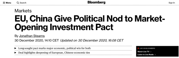 彭博社説,這份中歐長期以來尋求達成的協定,標誌着經濟與政治層面的重大雙贏,同時也凸顯出中歐之間不斷加深的經濟紐帶。