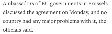 而早在協定達成的2天前,12月28日,路透社就獲知,歐盟27個成員國駐歐盟總部大使就中歐投資協定的談判情況進行評估,沒有一國大使提出重大異議。這為12月30日的官宣——雙方如期完成談判鋪平道路。