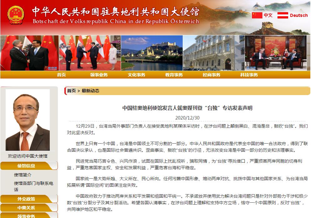奧媒刊登“台獨”專訪 中國駐奧地利使館:對此堅決反對