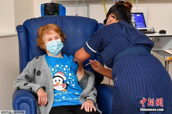 當地時間12月8日,英國開始接種新冠疫苗。圖為醫護人員為90歲女子瑪格麗特·基南接種疫苗。瑪格麗特·基南是該國首位接種新冠疫苗的民眾。