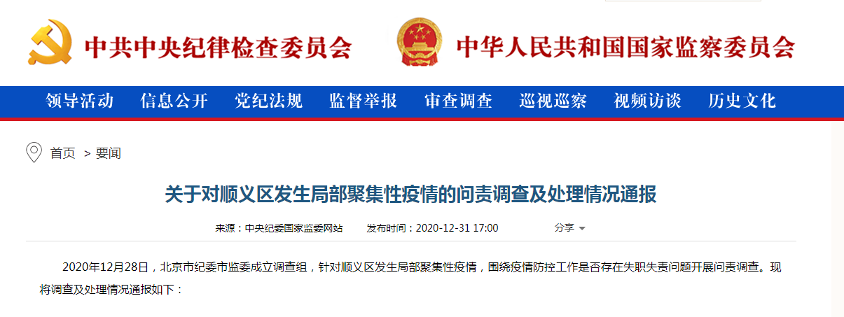 2020年12月28日,北京市紀委市監委成立調查組,針對順義區發生局部聚集性疫情,圍繞疫情防控工作是否存在失職失責問題開展問責調查。現將調查及處理情況通報如下: