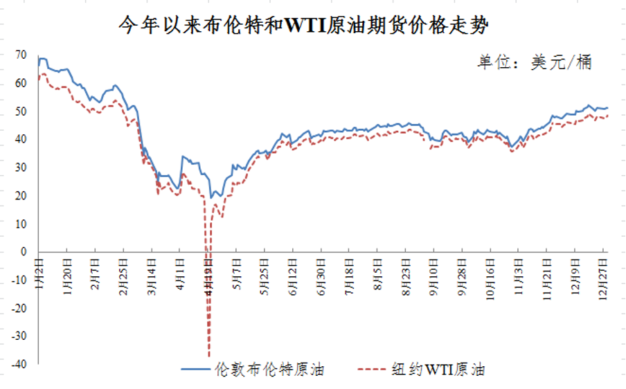 總的來看,今年國際油價整體呈現深“V”型走勢,上半年暴漲暴跌,多個記錄價位先後被打破,甚至出現史無前例的負油價,波動劇烈之勢前所未有;下半年持穩後上行,全年價格重心大幅低於去年同期。倫敦布倫特、紐約WTI原油期貨價格全年平均分別為每桶43.07美元、39.59美元,同比下降32.9%、30.6%。新冠肺炎疫情導致原油需求大幅下降,產油國之間的博弈和產出政策的轉變,是影響今年油價走勢的兩大主要因素。 國際原油期貨收盤價格(12月17日—12月30日)