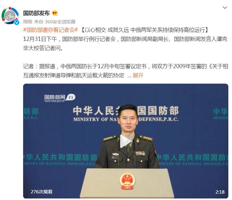記者:據報道,中俄兩國防長於12月中旬簽署議定書,將雙方於2009年簽署的《關於相互通報發射彈道導彈和航天運載火箭的協定》有效期延長10年,中俄兩軍12月下旬開展了第二次聯合空中戰略巡航。有評論稱,中俄密集開展軍事合作,展示了雙方的高度戰略互信。請問如何評價當前中俄兩軍關係?