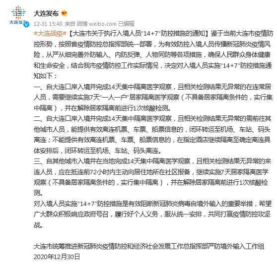 【大連市關於執行入境人員“14+7”防控措施的通知】鑑於當前大連市疫情防控形勢,按照省疫情防控總指揮部統一部署,為有效防控入境人員傳播新冠肺炎疫情風險,從嚴從細完善外防輸入、內防反彈、人物同防等各項措施,確保人民羣眾身體健康和生命安全,結合我市疫情防控工作實際情況,決定對入境人員實施“14+7”防控措施通知如下: