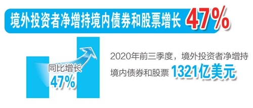 今年以來,金融業對外開放取得重要進展,彰顯出非常時期中國擴大開放的決心和底氣。外匯局統計顯示,前三季度,境外投資者淨增持境內債券和股票1321億美元,同比增長47%。