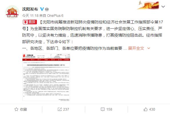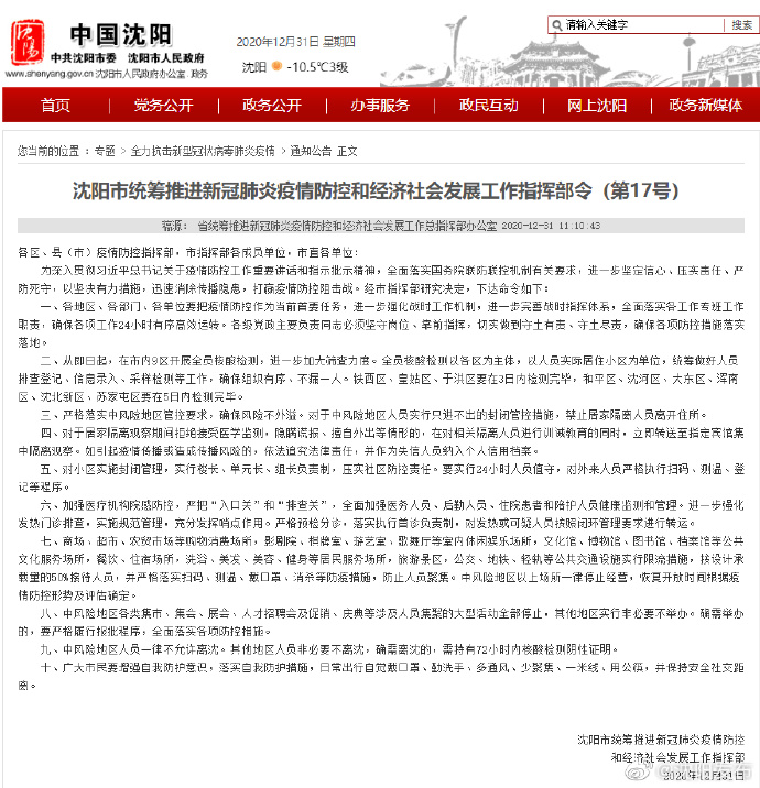 【瀋陽市統籌推進新冠肺炎疫情防控和經濟社會發展工作指揮部令第17號】為全面落實國務院聯防聯控機制有關要求,進一步堅定信心、壓實責任、嚴防死守,以堅決有力措施,迅速消除傳播隱患,打贏疫情防控阻擊戰。經市指揮部研究決定,下達命令如下: