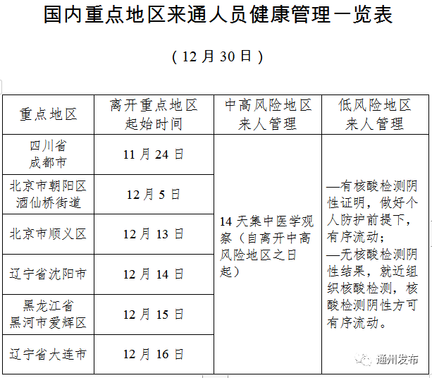 12 月 30 日,遼寧省大連市金普新區先進街道民馨社區、金普新區光中街道勝利西社區、沙河口區星海灣街道星海公園社區、高新園區淩水街道大有恬園社區由低風險調升為中風險,大連市3個行政區(含高新園區)存在中風險區。根據省市部署要求,請各地各有關部門按職責分工和規範要求,做好遼寧省大連市來通人員信息核查和健康管理工作。各鎮(街道)要組織村(社區)加強對遼寧省大連市來通人員主動排查,做好登記管理和健康監測。具體要求如下: