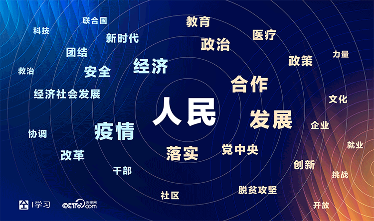 央視網I學習數據庫利用人工智能技術對總書記2020年講話高頻詞進行分析,高居前三位的是“人民”“發展”“疫情”。
