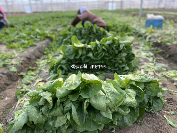 雖然江邊颳了一夜寒潮,萬幸的是,菜地沒有積雪,基本也沒出現冰凍的情況,而且陽光還挺好,大棚裏割菜乾活,也還算暖和。