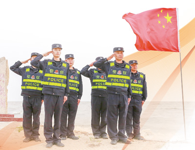 黑龍江出入境邊防檢查總站雞西邊防管理支隊民警在邊境執勤並向國旗敬禮。